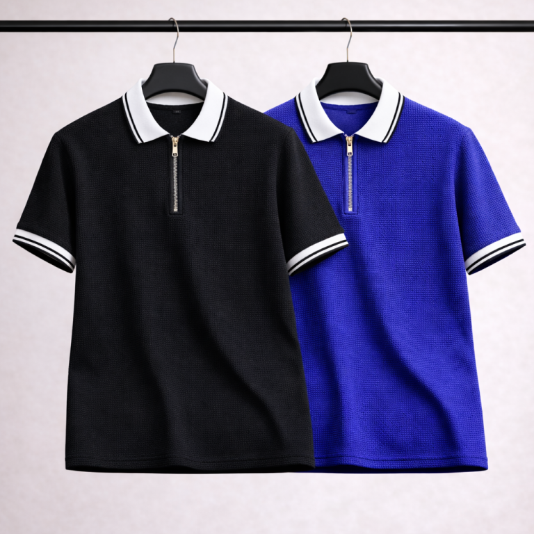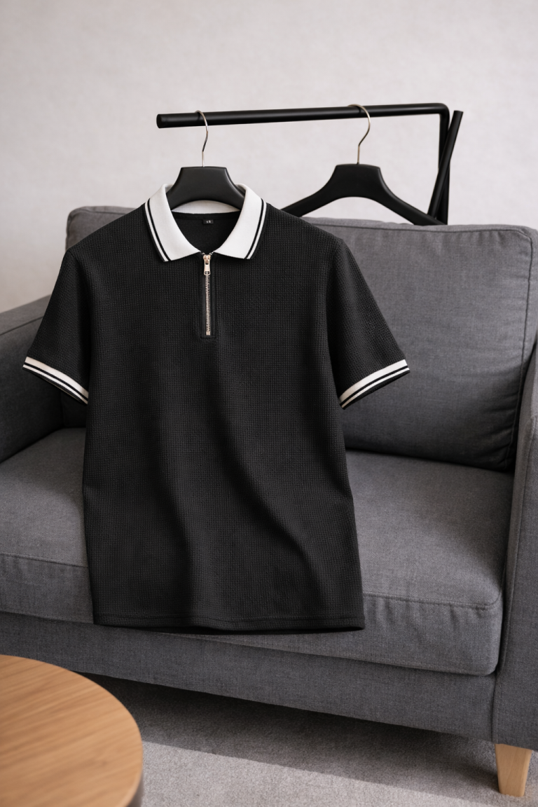 2 Pics Premium Waffle Zipper Polo Shirt(Black,Blue)