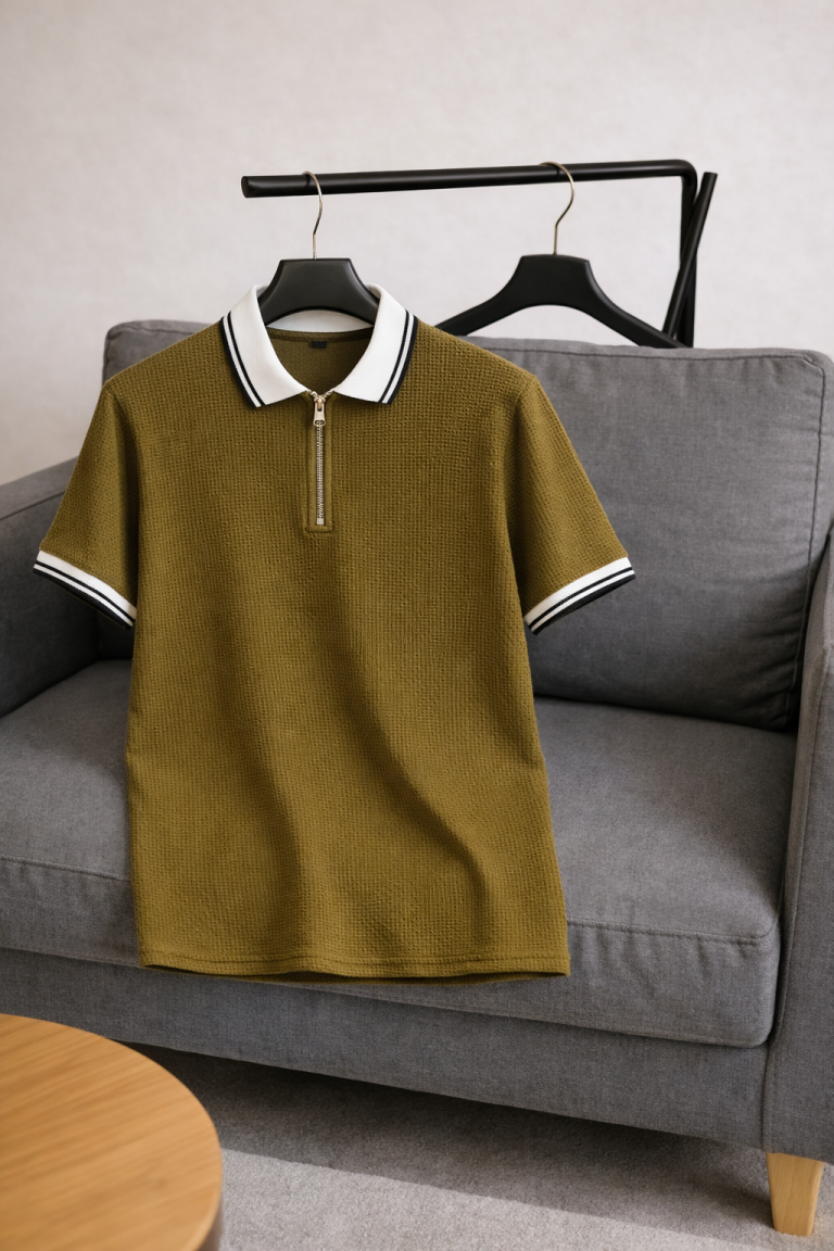 2 Pics Premium Waffle Zipper Polo Shirt(Olive,Black)