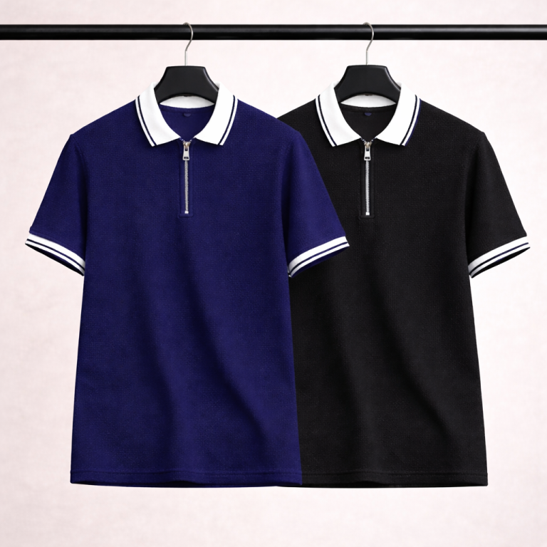 2 Pics Premium Waffle Zipper Polo Shirt(Royal Blue,Black)